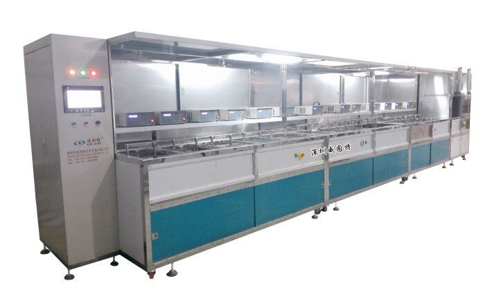 生化濾光片超聲波清洗機(jī)VGT-1609FP為生化濾光片超聲波清洗機(jī),設(shè)備共有16個(gè)功能槽,配置有環(huán)保液處理系統(tǒng)、循環(huán)過濾系統(tǒng)、自動恒溫系統(tǒng)、拋動系統(tǒng)、超聲波清洗系統(tǒng)、抽風(fēng)裝置、IPA漂洗系統(tǒng)、IPA烘干系統(tǒng)等。