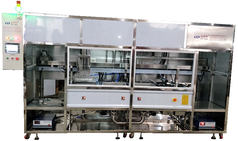 深圳威固特全自動硅襯底LED超聲波清洗機該清洗機是專為硅襯底LED清洗而設計的超聲波清洗設備。整個工藝流程使用PLC編程控制,可根據清洗工藝要求,靈活設置動作參數。